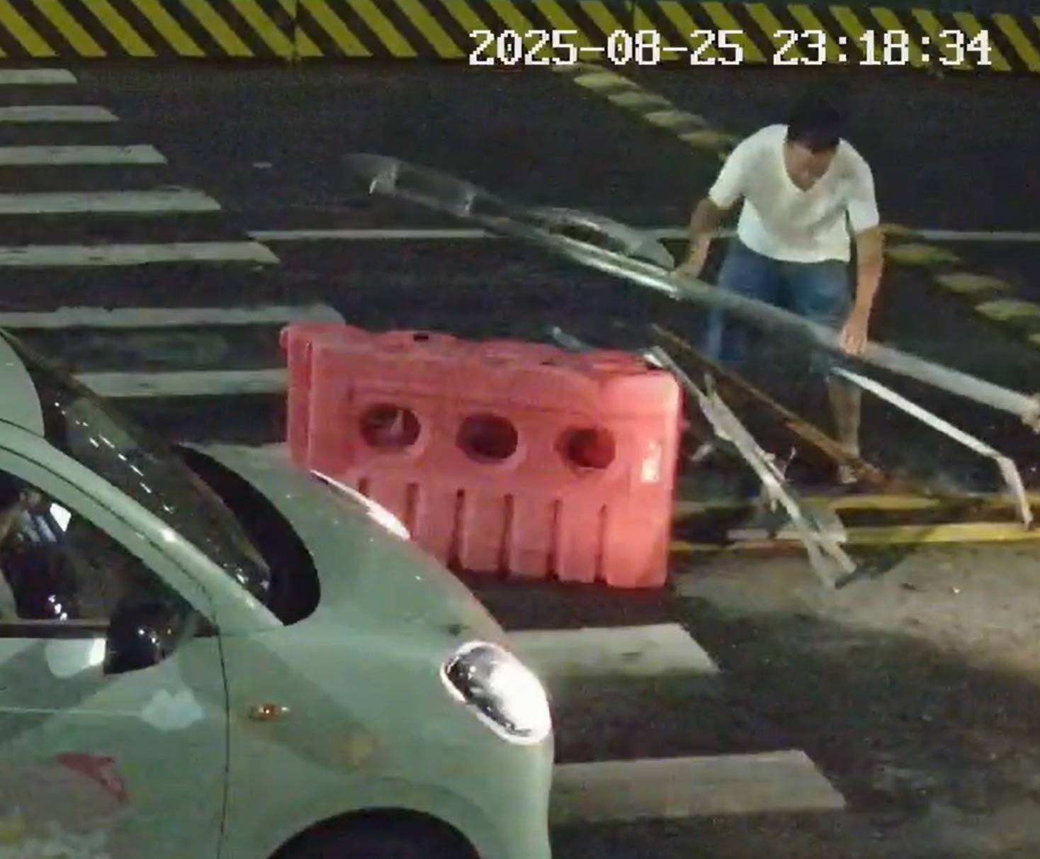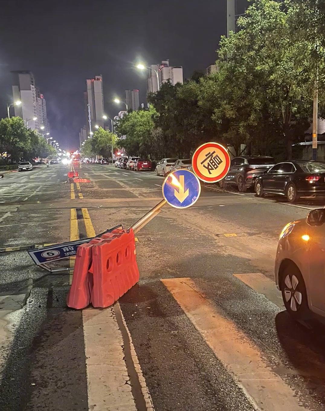 当晚23时18分许,一辆车牌号为鄂FDE1003的灰绿色小汽车经过此路段。刚刚下班准备回家的驾驶员李洪森下意识地减速慢行,发现了倾斜占据道路的指示牌。